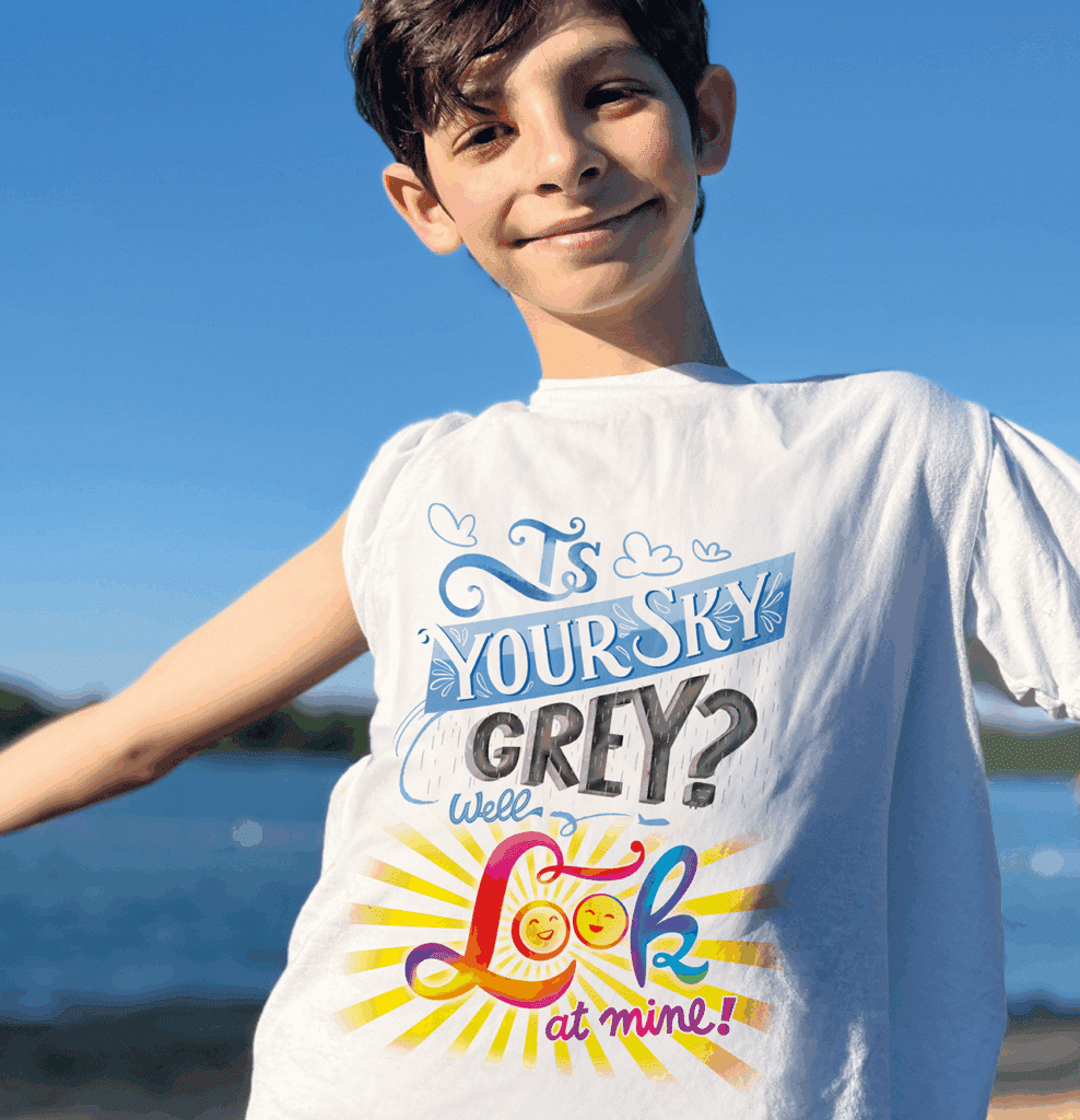 Je crée le design «IS YOUR SKY GREY? WELL, LOOK AT MINE!» – «Ton ciel est gris ? Regarde le mien !» –, inspiré par la capacité de Kenan à s’émerveiller aussi bien devant une sortie à la déchetterie que devant un donut à la fraise.