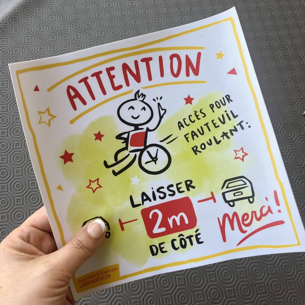 La maman d’un enfant en fauteuil me demande de créer un autocollant positif pour rappeler de laisser la place à la porte latérale.